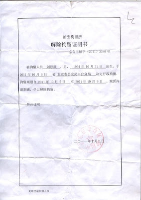 刚于10月9日从北京市公安局丰台分局拘留所出来的刘厚顺说,自己是山东省文登市永乐街人,一个无缘无故“被访民”的上访冤民。2005年1月,我到河南做生意,受朋友邀约于1月12日去了一趟首都北京,因我不会说普通话,在旅馆中被山东省文登市公安局的警察将我绑架到北京海军第三招待所,遭到两名警察(治安大队长丛培庆、副队长吴俊虎)严刑拷打,刑讯逼供,问我为了告谁来北京上访的? 因我不是上访的,不知道什么叫上访,答不上来,被打的遍体鳞伤,后经法医鉴定为轻伤。