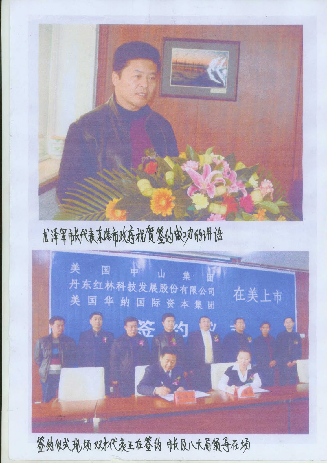 2009年2月9日,东港市人民政府在市政府文化礼堂隆重举行“美国中山集团-丹东红林科技发展股份有限公司在美国上市”的签约仪式签约仪式上由副市长龙泽军主持和发表重要讲话,称丹东红林科技发展股份有限公司在中山集团的帮助下,丹东红林科技发展股份有限公司将在美国上市。一时间,丹东市和东港市的电视台对盛况空前的签约仪式进行连续不断的渲染,老百姓被丹东红林科技发展股份有限公司即将到美国上市这一极具诱惑力事件所吸引!大家纷纷向丹东红林科技发展股份有限公司投资,等待着原始股投资的丰厚回报。