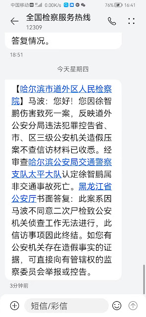 2022年12月22日,正当马波在追这个有可能有人冒领困难补助款时,道外区检察院又给马波发来短信,称因为马波不同意对徐智鹏做第二次尸检,导致公安机关侦查工作无法进行,如果公安机关在该案中有造假行为的证据,告知马波通过向监察委进行举报控告程序维权。