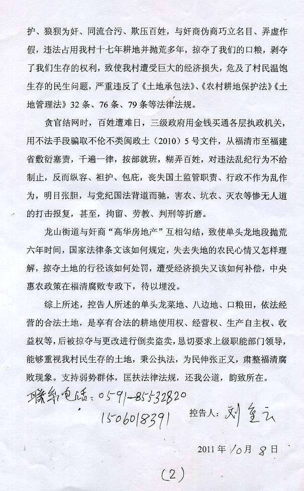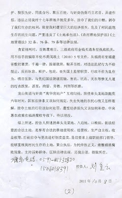 福建福清市龙山街道南宅村的失地农民俞明华,自10月1日刚刚走出冤狱,就再次参与村民们自发的、控告当局官商勾结倒卖土地行为的联名控告。