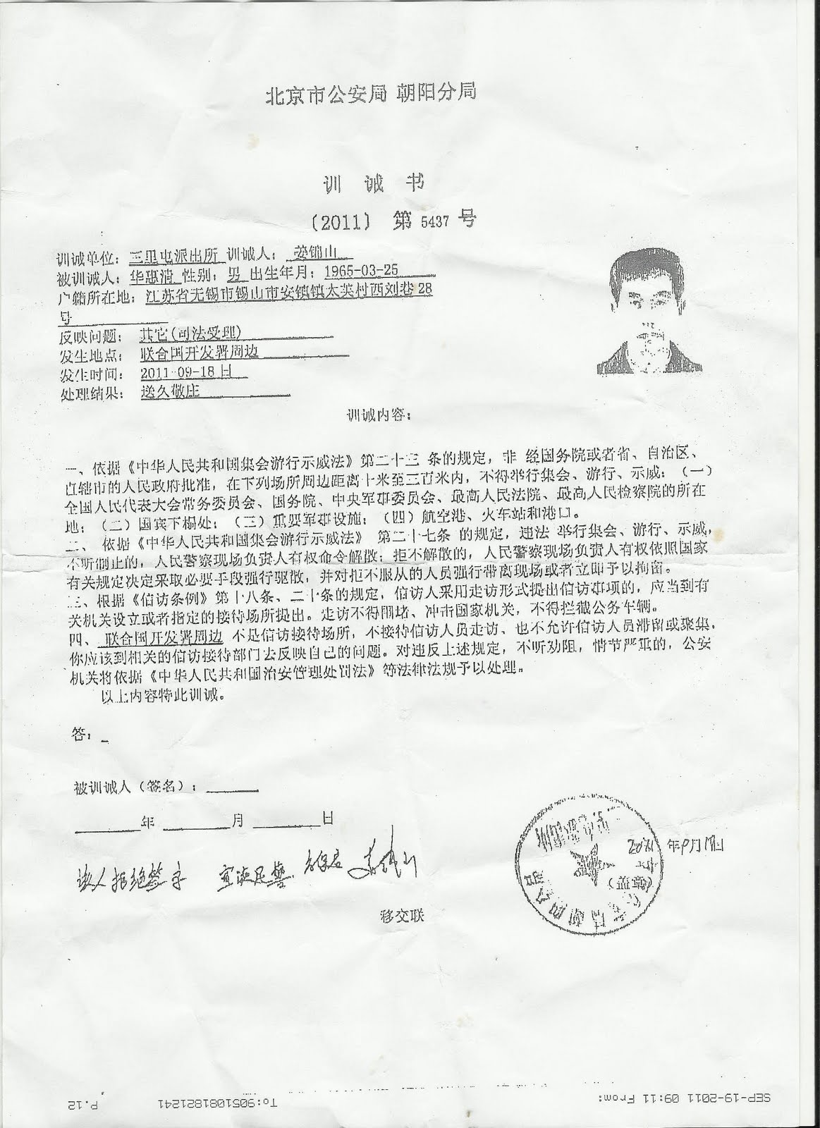 (且不说这北京公安出具训诫书的真实性,既然华惠清已经受到处罚,无锡当局凭什么一事两罚?)