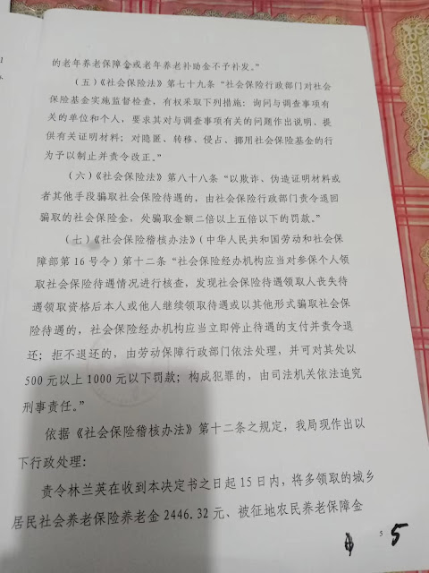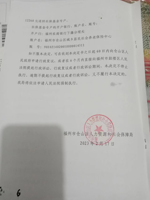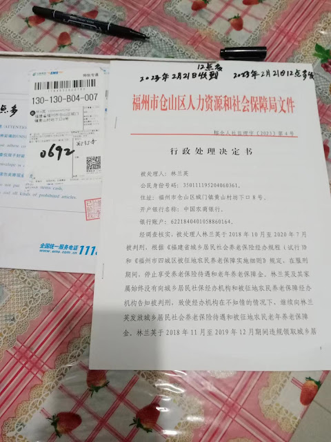 (维权网信息中心报道)2023年2月23日,本网获悉:昨天,正在医院服侍老伴郑金铨的福州市仓山区城门镇失地农民林兰英老太,突然收到福州市仓山区人社局的行政处理决定书,说要对其服刑期间发放的22个月的12260元的退休金扣回去,并开始停止发放其以土地换取的退休待遇。