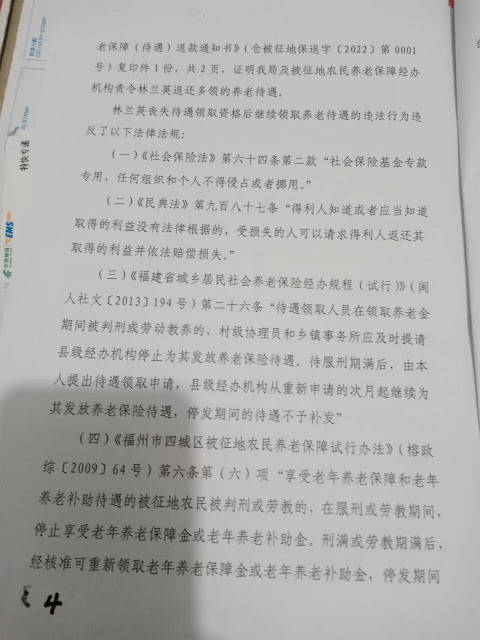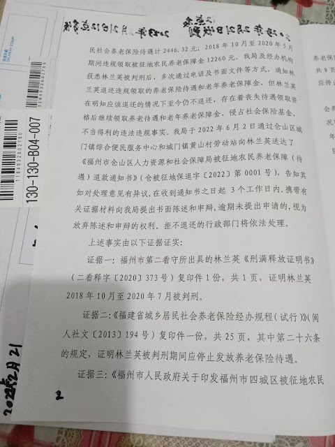 福州市仓山区城门镇失地农民林兰英,是因为轰动全世界的2018年的“9.12鞭炮案“中,被当局以”寻衅滋事罪“判刑22个月。在林兰英即将出冤狱时被仓山区人社局以“福州市四城区被征地农民养老保障试行办法”第六条第(六)项规定,即领取失地农民保障金期间被判刑、劳动教养的情形,对其以土地换取的养老金实施克扣。