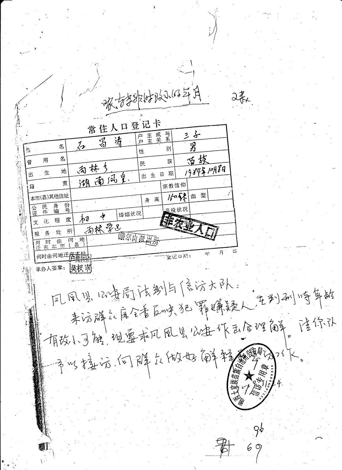 (在这一份石昌涛的出生年月登记上,称石昌涛为非农业户籍,没有其家长的签字或者按手印。如果这一份登记是真实和可采信的,那么就不可能出现到农村再重复登记的情况)