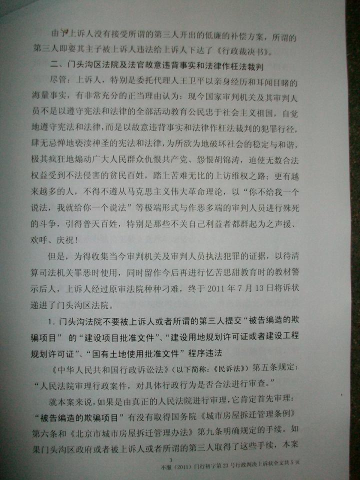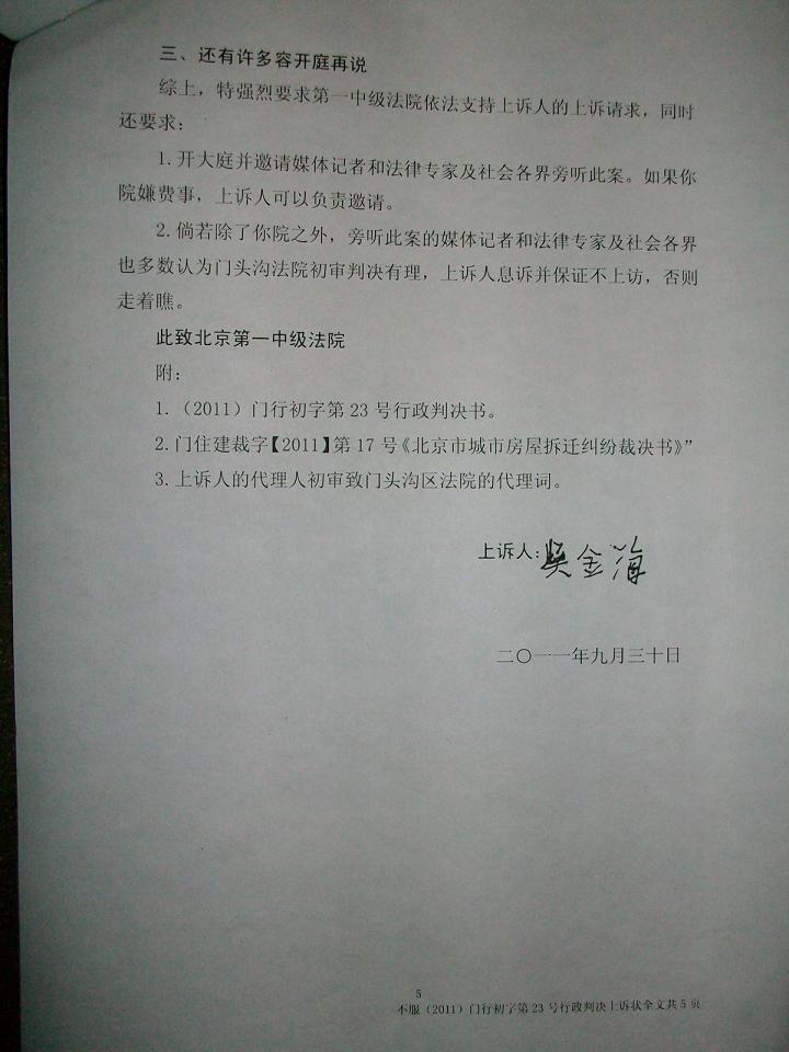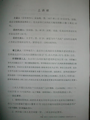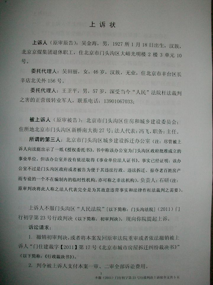 对于北京市门头沟区人民法院不顾北京市门头沟区住宅和城乡建设委员会没有履行法定职责的违法行政行为所作出的枉法判决(见权利运动10月5日“编辑门头沟区政府指使法院枉法裁判”),今日(10月8日)上午,吴金海老人委托其女儿吴田丽向北京市门头沟区人民法院递交上诉状,向北京市第一中级人民法院提起上诉。