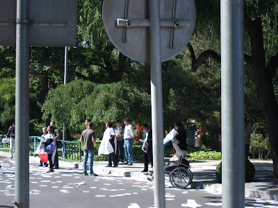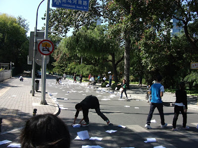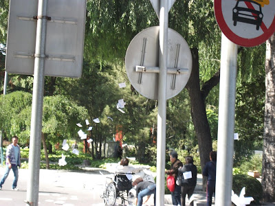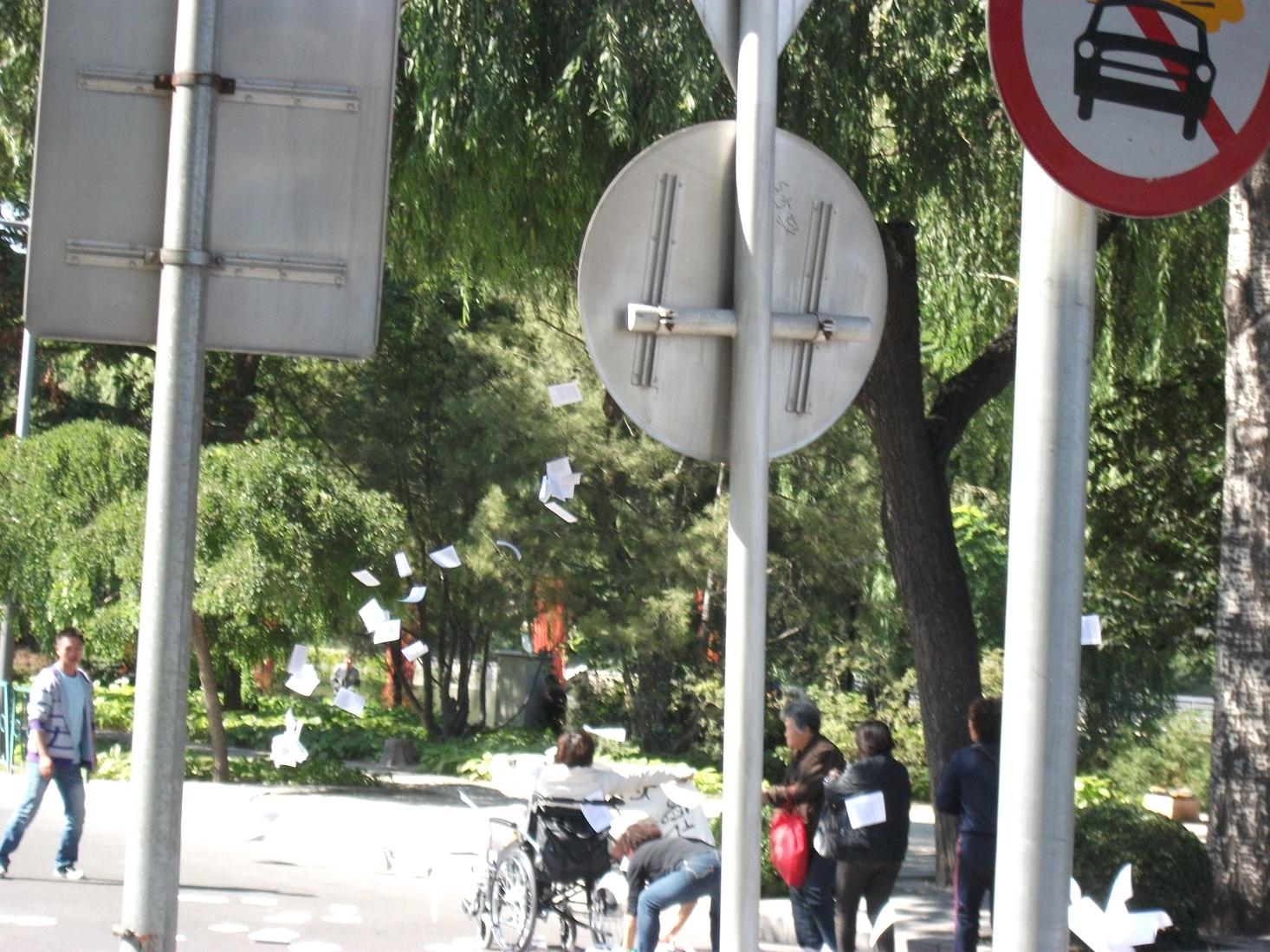 昨天是“十一”党国国庆,中午12:30分左右,吉林辽源访民王兴权、山西大同访民王利君、河南访民华秀真、吉林访民董玉兰、以及坐着轮椅的福建残疾访民的小伟等来自于全国各地的冤民不约而同来到了北京建外使馆区,在亮马河南岸的联合国“驻京办”抛洒传单,请求国际社会关注中国大陆恶劣的人权状况和司法不公现象。