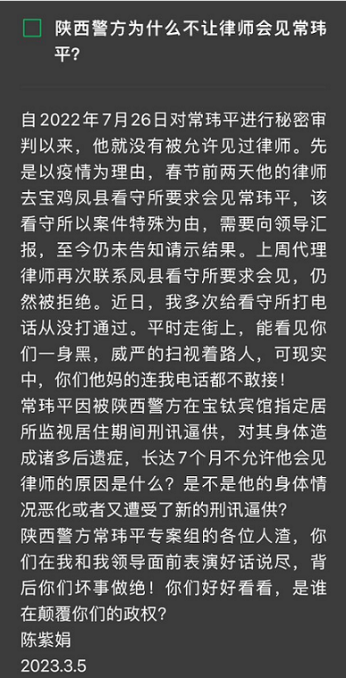 据常玮平妻子陈紫娟介绍:自去年2022年7月26日对常玮平律师秘密审判以来,中共当局非法剥夺了常玮平的合法会见权,以种种借口不予律师会见,而陈紫娟多次向看守所打电话要求解释,相关部门和人员竟然连陈紫娟的电话都不敢接。