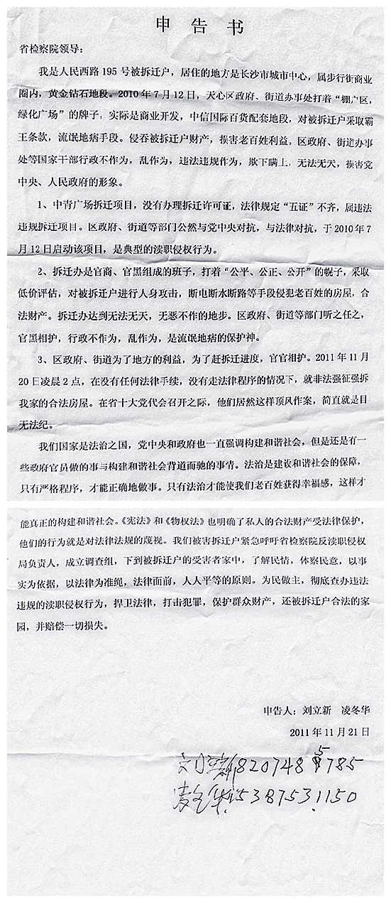 刘立新:我家住在长沙市人民西路195号,昨天晚上快两点钟了,拆迁办带着一帮黑社会的人,用挖机强挖了我家的房子,我家的房子受到了很大的损失,现在我已经不能在此生存,希望各级政府和各级领导为民做主。