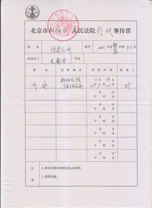 据悉,因被告北京市朝阳区公安分局滥用职权对原告实施行政拘留后,原告要求被告公开行政拘留的相关信息,结果被告无法提供行政处罚的依据,原告遂将朝阳区公安分局告上法庭。朝阳区法院受理原告的行政起诉后,行政处罚案中有利害关系的上海访民项文寅、陈燕燕、蔡文君、端木家寿、朱萍萍、袁国平、陆杰、陆福忠等9人向法庭申请要求以第三人和证人身份参加11月18日的庭审,但审判长武楠严重违反法定程序,对第三人和证人的申请不予审查。