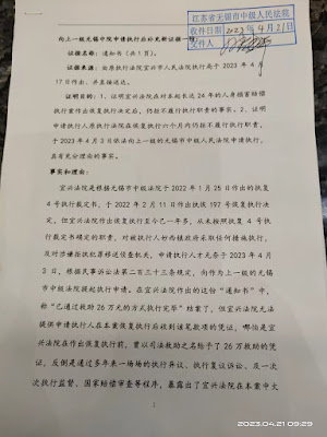 4、今天第五次来见负责人,就是要将宜兴法院在本周一送达的这份通知书,作为因宜兴法院在中级法院作出4号执行裁定、并恢复执行决定后,仍不履行执行职责而依法向上一级的无锡市中级法院提起申请执行的新的证据。今天也就只有一个诉求,请中级法院依法作出受理决定。