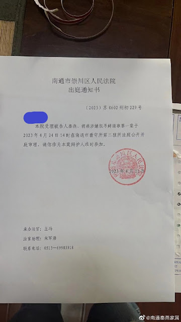 2022年8月10日,秦燕女士在南通市平潮的婆家突然被南通崇川区治安大队带走,并以“涉嫌寻衅滋事罪”为由,由南通市公安局崇川分局唐闸派出所警察李响持如皋市公安局白蒲派出所搜查令,对她位于南通市城区的家里和店铺进行了搜查,查扣了电脑、移动电话等。同年9月27日,秦燕的嫂子胡燕在工作的万达广场被以同样罪名抓捕。