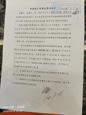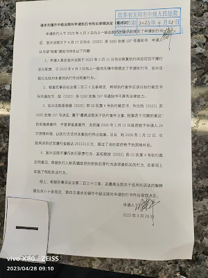 (维权网信息中心报道)2023年4月28日,本网获悉:今天(周五)上午,又是江苏省无锡市中级法院例行的执行局负责人接待日,维权人士张建平就其人身损害赔偿执行案第四次见执行局负责人,终于见到了负责他的案件的分管领导缪新处长。这是继去年5月13日向中院执行局邱必友局长提交执行监督申请后,第六次见该局的负责人。