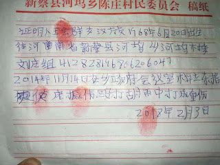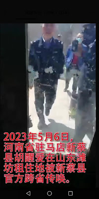 (维权网信息中心报道)2023年5月8日,本网获悉:河南省新蔡县河坞乡陈庄村访民胡醒爱今天发出求救信息,称前天(5月6日)上午九点,其户籍地河坞乡派出所所长杨冬冬、乡人大主席李昌盛、民警将艳丽等人,跨省到她现在租住的山东潍坊市奎文区南屯村出租屋,以“扰乱单位秩序”为由传唤她。