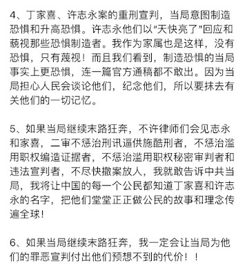 5、如果当局继续末路狂奔,不许律师们会见志永和家喜,二审不惩治刑讯逼供施酷刑者,不惩治滥用职权编造证据者,不惩治滥用职权秘密审判者和违法宣判者,不尽快撤案放人,我就敢告诉中共当局,我将让中国的每一个公民都知道丁家喜和许志永的名字,把他们堂堂正正做公民的故事和理念传遍全球!