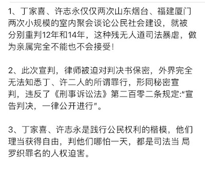 1、丁家喜、许志永仅仅两次山东烟台、福建厦⻔两次小规模的室内聚会谈论公⺠社会建设,就被 分别重判12年和14年,这种残无人道司法暴虐,做为亲属完全不能也不会接受!