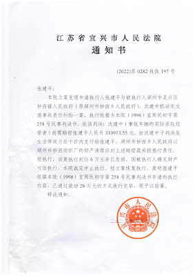 在认真查阅了(2022)苏0282执恢197号整个案卷后,张建平先生马上向宜兴法院负责审查其第三次提起的国家赔偿案承办人蒋毅斌庭长,通报了宜兴法院以“已通过26万司法救助方式执行完毕”结案的执行行为,在案卷中没有任何支持该执行行为的证据。