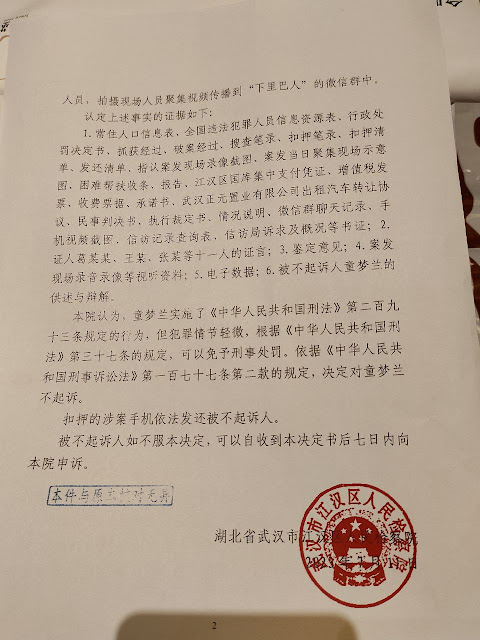 (维权网信息中心报道)2023年7月12日,本网获悉:因支持武汉退休老人抗议医改的“白发运动”的武汉出租车司机童梦兰(阿梦)已于昨日2023年7月11日夜间被释放,共被关押近五个月之久,现以不予起诉被释放。