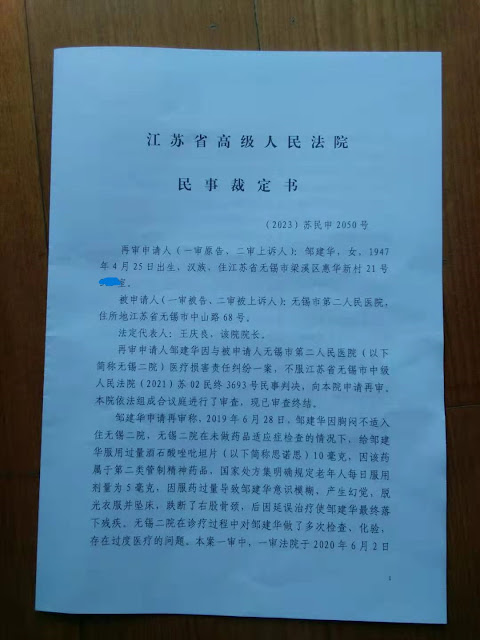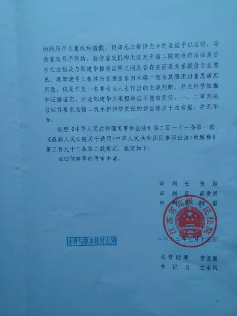 (维权网信息中心报道)2023年7月19日,本网获悉:昨天,医疗过错行为受害人邹建华老太收到江苏省高院的(2023)苏民申2050号民事裁定书,该民事裁定书以邹建华老人举证不能为由,驳回了她的再审申请。面对如此荒唐的驳回理由,今年已经77岁的、具有高职称的邹建华表示,自己并不在乎那点赔偿,但为了起码的公正,一定坚持申诉下去。