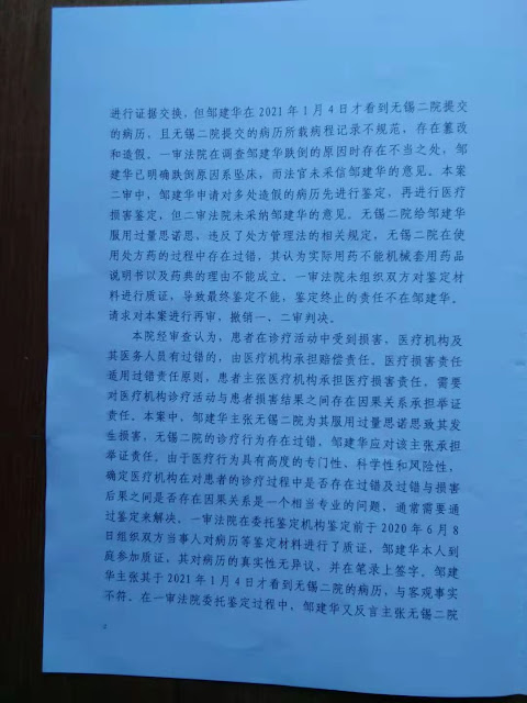 该案进入再审受理(审查)期间,邹建华老人在2023年5月10日由老伴推着轮椅赶到江苏省高院,就无锡市两级法院在她医疗损害纠纷一案中,明显偏袒医疗事故责任方的民事判决行为,向合议庭提交补充材料及新的证据,证明邹建华老人根本不存在原审法院所称的对委托鉴定存在过错,而且违法的医疗诊疗行为根本无须鉴定。邹建华老太说,当时下来接材料的法官助理,说合议庭一定会对该案认真审查,叫她放心。结果,连个谈话(听证)程序都没有走一下,就直接裁定驳回了。