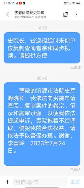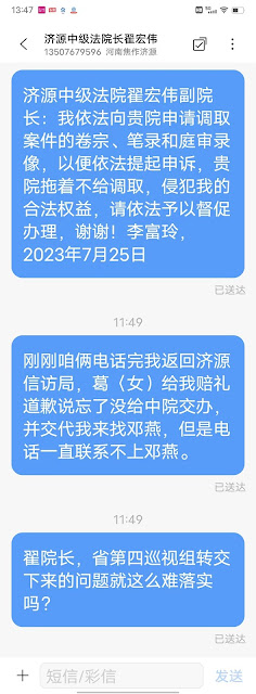(维权网信息中心报道)2023年7月25日,本网获悉:昨天上午,河南省沁阳市维权人士李富玲二度走访驻河南省济源市信访局的省委第四巡视组,要求对济源市法院和济源市中级法院无理拒绝查阅自己案卷行为进行查处。李富玲女士说,接待她的巡视组工作人员当场联系了相关部门,她也给济源市法院的院长发了短信,然而今天去两级法院,无论济源市法院还是济源市中级法院均不予理睬,也就是根本不尿省委巡视组的指令。
