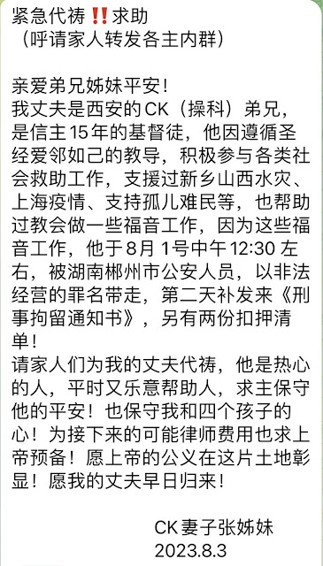 西安基督徒操科在湖南郴州市被 以非法经营的罪名刑事拘留 2023-08-04 权利运动编辑 (维权网信息中心报道)2023年8月4日,本网获悉:西安基督徒操科在湖南郴州市被以非法经营的罪名刑事拘留。 西安基督徒操科受洗已15年。他因遵循圣教导,积极参与各类社会救助,支援过新乡山西水灾、上海疫情,帮助过孤儿难民,也参与教会的福音事工。 因为传播福音工作,他于2023年8月1日中午12:30 左右,被湖南郴州市公安人员,以非法经营的罪名带走并刑事拘留。 本文转载自:https://wqw2010.blogspot.com/2023/08/blog-post_29.html 分享这篇文章到: