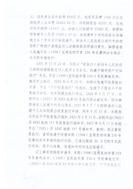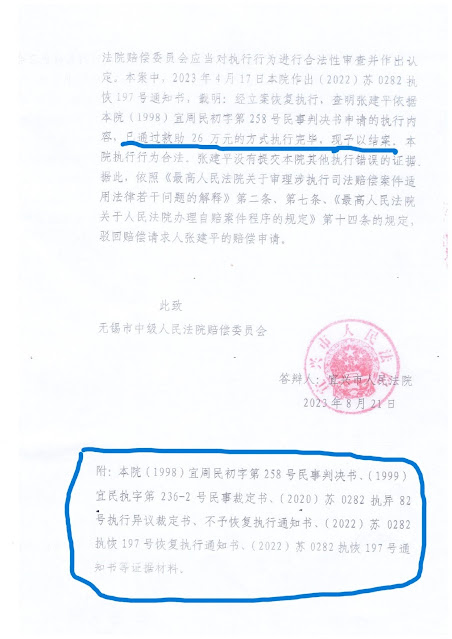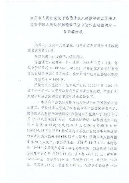 这是一起因中国特色的徇私枉法叠加不法维稳,导致张建平先生父母亲在血腥维稳下失去生命的国赔案!本网将对无锡市中院国赔委在本案的审理中如何有效执行国家赔偿法,及最高法院的《涉执行司法赔偿案件适用法律若干规定》给予持续关注。