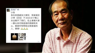 (维权网信息中心报道)2023年9月18日,本网获悉:广州著名维权人士区少坤(区伯)昨晚因病逝世。