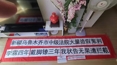 今天,我在家用我自己的方式抗争!我在窗外挂出「新疆乌鲁木齐中级法院大量造假,冤判李霖4年,戴脚镣3年,我状告无果,还被截访」的横幅。