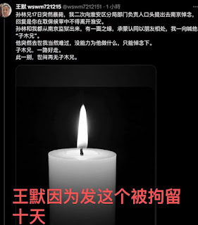 (维权网信息中心报道)2023年9月10日,本网获悉:江苏人权捍卫者王默因日前发布推文悼念疑被南京国保上门杀害的孙林而被行政拘留十天。