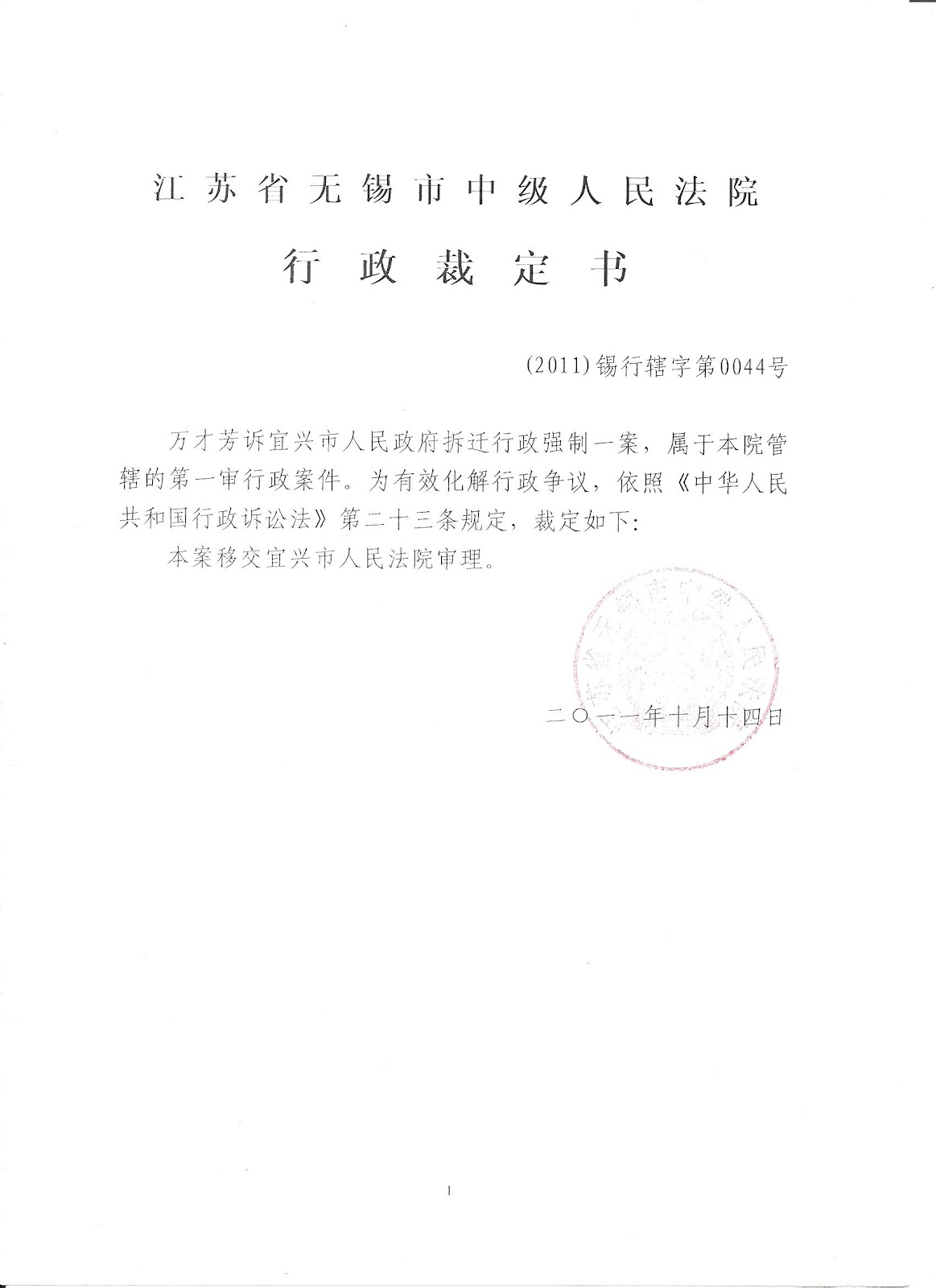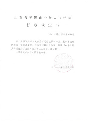 (无锡市中级法院去年10月14日就裁定由宜兴市审理,结果当事人万才方在三个月审期过了才拿到法院送达的被告宜兴市政府的答辩状)