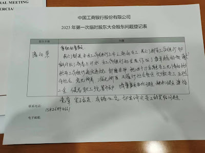 然后,有工作人员就拿来一张“中国工商银行股份有限公司2023年第一次临时股东大会股东问题登记表”给那位股东,我们也没能见到董事长,就在提问登记表上写下了自己提出的问题,表决票投进了信箱,登记表交给了工作人员。
