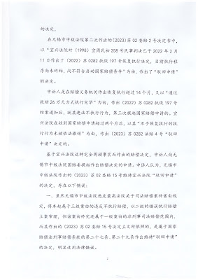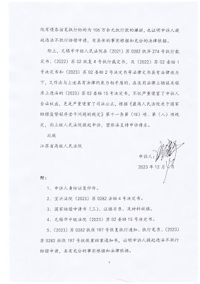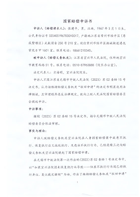 (维权网信息中心报道)2023年12月4日,本网获悉:今天上午,宜兴法院违法(故意)不执行的被害人、非刑事司法赔偿权利人张建平先生,不服江苏省无锡市中级法院国赔委(2023)苏02委赔15号维持“驳回申请”的决定,认为该决定适用法律错误,及程序违法,向江苏省高院邮寄申诉材料,请求根据《关于国家赔偿监督程序若干问题的规定》第十三条第(三)项,指令无锡中院国赔委依法审理。