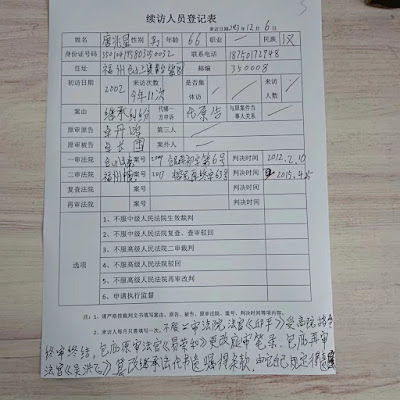 (维权网信息中心报道)2023年12月6日,本网获悉:今天上午,福州市仓山区上渡街道的维权人士唐兆星到福建省官员,提交了信访事项登记表,窗口一个20多岁的工作人员接收了他的材料,机械地告诉他回去等待。因为没有见到院领导,唐兆星再到福建省高院举白纸抗议司法不公,及领导不作为。