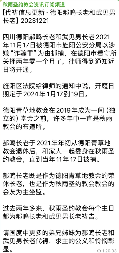 四川省德阳市秋雨青草地归正教会郝鸣、武见男长老案将于2024年1月17日至19日开庭