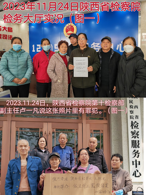 2023.11.24日当天到陕西省检察院上访遭威胁、打压、拒不接待的数十名维权群众于当晚把在陕西省检察院检务大厅拍的照片和视频分别公布在微信群、抖音、快手等网络平台上,不到一个小时就被封贴封号删除了,堆积如山的陕西省陈年冤假错案再次被乌云蔽日。