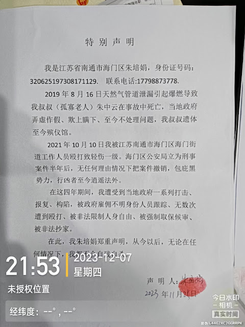 至本网发稿时,海门区公安局在超过24小时的法定时限内,仍然没有向朱培娟的家属送到强制措施的手续,等于公然将办案程序践踏在傲慢的权力之下。