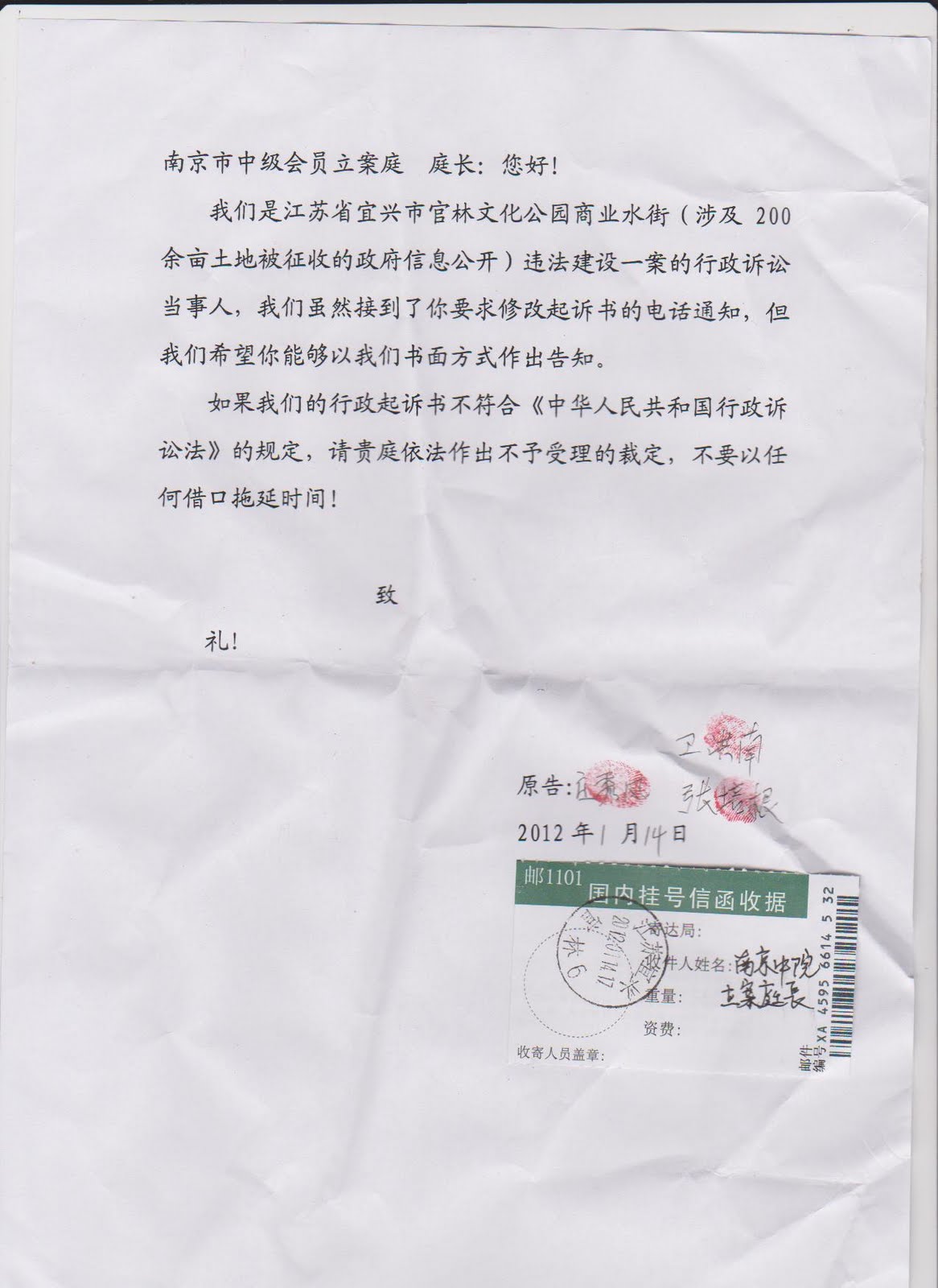 我们是江苏省宜兴市官林文化公园商业水街(涉及200余亩土地被征收的政府信息公开)违法建设一案的行政诉讼当事人,我们虽然接到了你要求修改起诉书的电话通知,但我们希望你能够以我们书面方式作出告知。