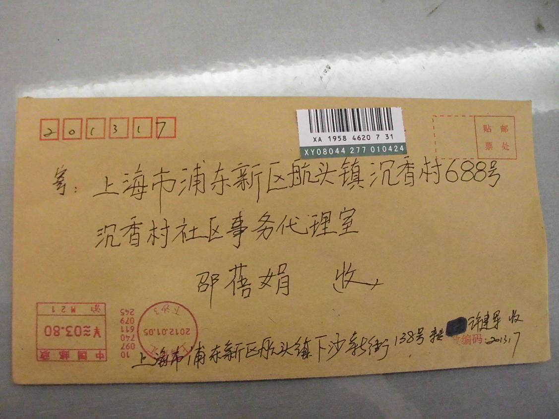 附许建军致“上海市浦东新区航头镇沉香村社区事务代理室”的信件