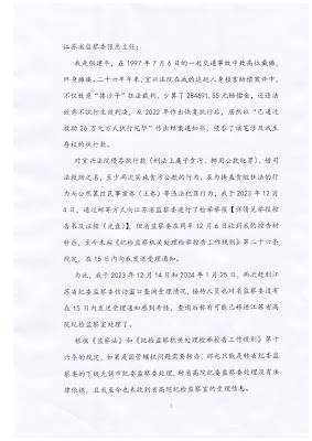 (维权网信息中心报道)2024年2月1日,本网获悉:今天,人权捍卫者张建平先生致信江苏省纪委书记、监察委主任张忠,就他于2023年12月4日提交的、对宜兴法院在他人身损害赔偿案件中实施包括侵吞他执行款的实名举报,请求按《监察法》和《纪检监察机关处理检举控告工作规则》的程序规定,依法受理和依法处理。