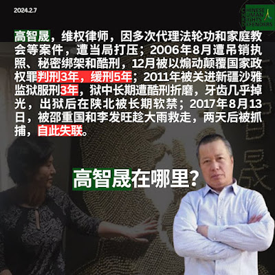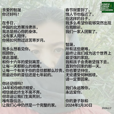 (维权网信息中心报道)2024年2月8日,本网获悉:2024年中国春节将至,这是著名人权律师高智晟先生遭强迫失踪的第七年个年头,但至今杳无音讯、生死不明,日前高智晟妻子耿和再次发出强烈呼声,愿高智晟早日回家、早日团聚。去年,世界各地的人权捍卫者们共同发起全球联动寻找遭强迫失踪的高智晟律师的行动。维权网在此再次强烈呼吁各民主国家政府、国际社会为高智晟先生的自由而行动。