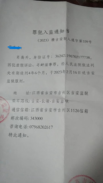 (维权网信息中心报道)2024年2月21日,本网获悉:江西省吉安市的劳工权益捍卫者肖青山(本名肖高升),因帮助弱势群体通过诉讼维权,在2021年九月底被吉安市公安局青山分局秘密抓捕,同年11月5日被“涉嫌寻衅滋事罪”刑拘,最后被以“虚假诉讼罪”、“寻衅滋事罪”判刑4年6个月,2023年2月16日从江西省吉安市看守所转到吉安监狱服刑。