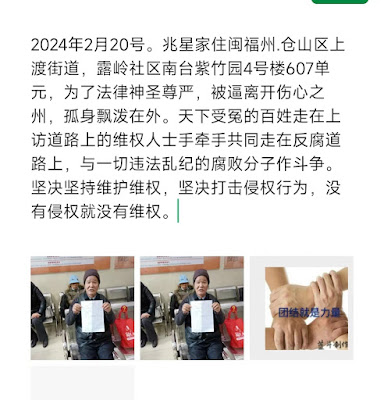 (维权网信息中心报道)2024年2月23日,本网获悉:自从除夕夜被严密稳控的福建省福州市仓山区访民、举白纸老人唐兆星,居然能趁看守一时疏忽大意,辗转河北保定绕道于昨天成功抵达北京,并顺利到位于北京市朝阳区小红门乡红寺村40号的最高法院提交了申诉材料。