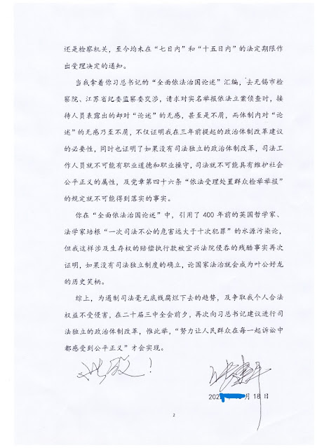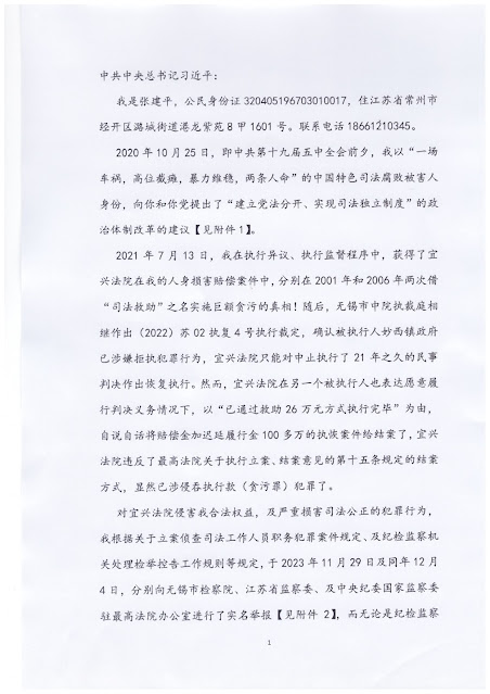 这是张建平先生继2020年10月25日,应习近平总书记在十五届五中全会“问计于民”的开明态度,提起“党法分开”的政治体制改革建议后,第二次向他及中共中央提起司法独立的政治体制改革的建议。