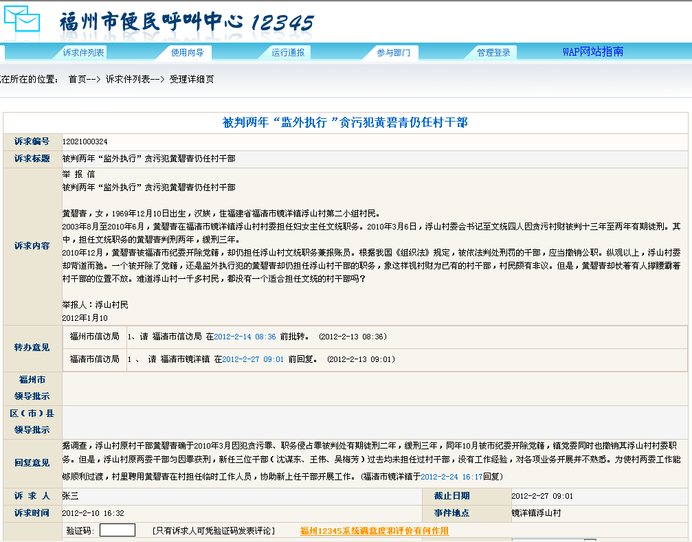 实在不踏实的村民们依据《组织法》的规定,决定通过网络向福州市市长热线反映,福州市人民政府网站的效率不错,村民们于2012年2月10日举报反映,市长先生仅仅4天时间就给予了解答,称虽然原浮山村的村干部黄碧青确实尚在村民们举报的缓刑期间,但考虑到浮山村新的“两委”领导没有工作经验,对开展业务不熟悉,故聘请黄碧青担任村“两委”的临时工作人员,协助村“两委”领导顺利过度和开展工作。