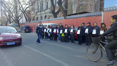 由于临近全国“两会”期间,上海市驻京办工作人员在我们之前,早早就等候在东交民巷27号,看到我们就主动上前打招呼:不要喊口号,相互配合一下,签好来人名单,拍几张照片早点离开吧,我们也是工作需要。相互之间没有发生冲突,这次前来请愿的代表只有26人。九时半代表们身挂“我要立案、捍卫法律、还我诉权”胸牌,向最高人民法院立案庭递交:“1060人的请愿书,已向最高人民法院递交的321个立案的清单名册,另附有签名的复印件清单和《督察简报》”。一位没有任何标记身份的人接待我们,看了看我们的材料,就给我们一张去北京朝阳区小红门乡红寺村40号的路条。