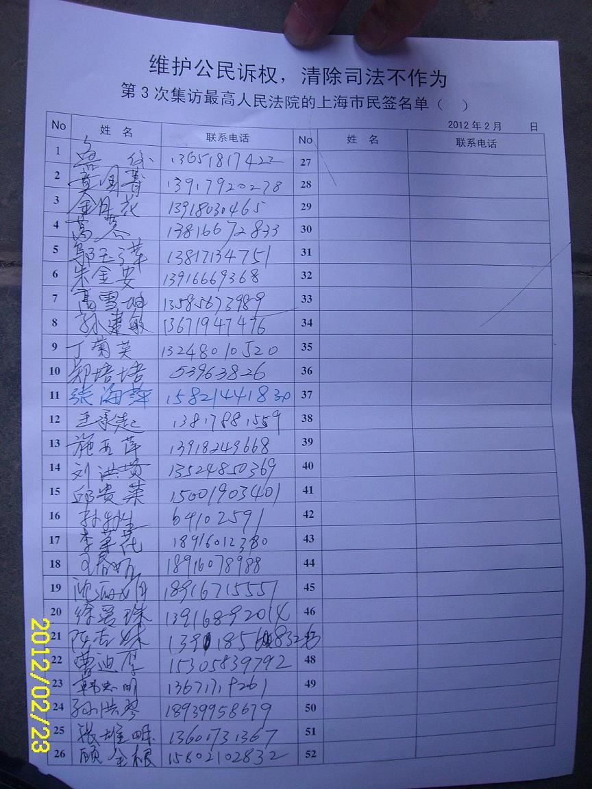 2012年2月23日上午九时,上海26位市民代表1060人的请愿书,如期约定每月最后一个周四向中华人民共和国最高人民法院(北京市东交民巷27号)请愿,请求最高法院捍卫法律尊严,维护公民诉权,保障司法公正,同时请求最高法院查处上海市三级法院违反《中华人民共和国宪法》的相关规定和违反最高人民法院关于执行《民事诉讼法》和《行政诉讼法》条文规定的立案受理期限。