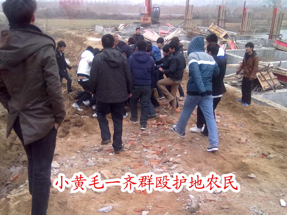 2012年元月3日上午10时许,开发商何卫东等人组织一大群黑帮打手(俗称“小黄毛”),带着挖掘机,强行无理的拆毁汪棚乡大皮村上石柱村民组让凤池等三户农民在自己土地上建筑的房屋基槽,一些农民因为阻止强拆遭到了“小黄毛”的殴打,当场打伤张玉环(女)、让凤霞(女)、宋辉、张玉芝(女)四人,录像、照片相信你已经看到!