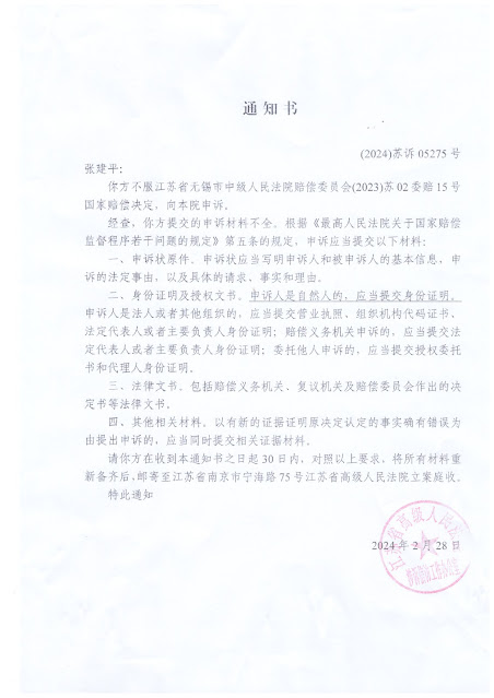 (维权网信息中心报道)2024年3月19日,本网获悉:2024年3月6日,国家赔偿权利人张建平收到江苏省高级法院(2024)苏诉05275号通知书,称张建平先生提交的国家赔偿申诉材料中缺少身份证证明,要求在30日内提交。昨天(2024年3月17日),张建平先生通过邮寄方式,向江苏省高院“补交”了身份证复印件,并在EMS邮封上明确备注了材料及页数。