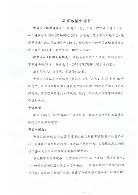而且,到2024年1月21日,张建平先生因江苏省高院夏道虎院长在收到他的国家赔偿申诉书及相应材料后,仍然没有依法立案,又根据《最高人民法院关于国家赔偿监督程序若干问题的规定》第十四条第二款规定,向最高人民法院张军院长邮寄了国家赔偿申诉书及相应材料。从程序(流程)上来说,最高法院应该早就将申诉材料转江苏省高院了。