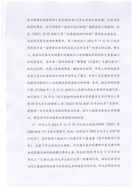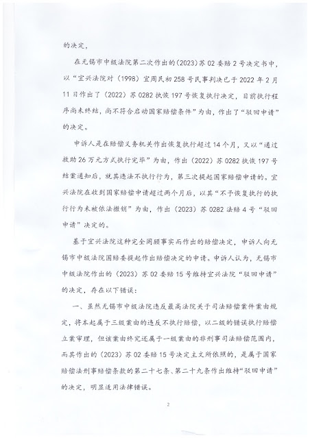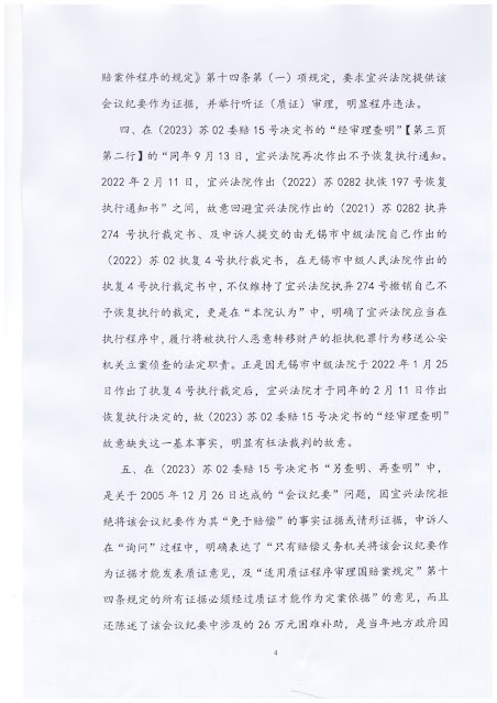 另外,在张建平先生收到江苏省高院的“补交”身份证明通知第二天(3月7日),赔偿义务机关宜兴法院所在地的宜兴市政法委和宜兴市信访局负责人还赶到张建平家中,表达了愿意通过和解方式解决赔偿的问题,并给出了具体的补偿方案,但承诺尽快落实并没有兑现,而且没有任何解释。